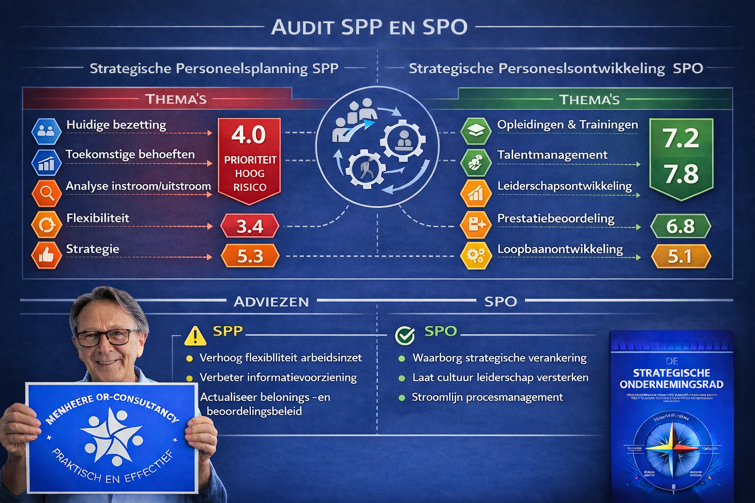 Een van de grootste risico's voor organisaties is de mismatch tussen toekomstige organisatiedoelen en de aanwezige medewerkers. Door SPP en SPO te combineren in één audit ontstaat een helder beeld van zowel de verwachte personeelsbehoefte als de mate waarin de huidige medewerkers hierin kunnen meegroeien. Hiermee worden strategische mismatches vroegtijdig zichtbaar en kunnen gerichte interventies worden ingezet.